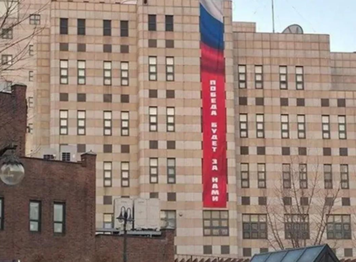 Посольство Росії в Сеулі зняло великий скандальний банер з написом російською мовою Перемога буде за нами зі...
